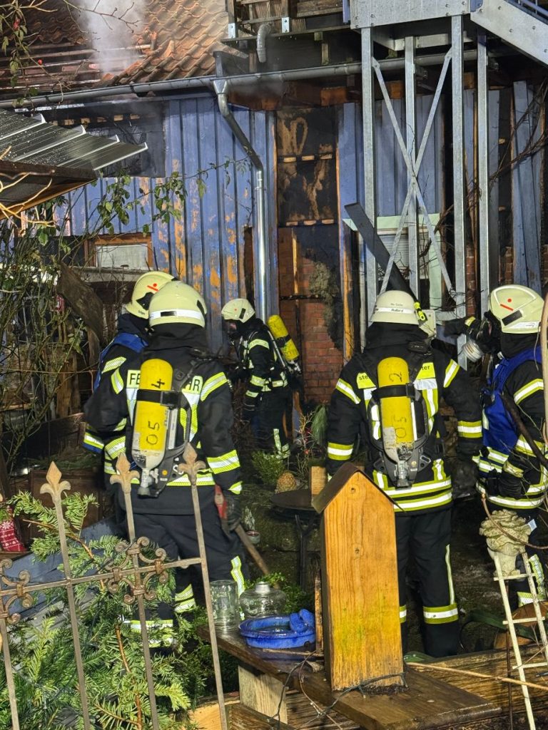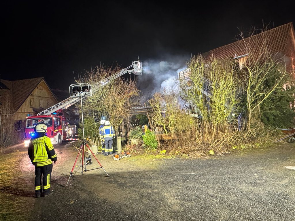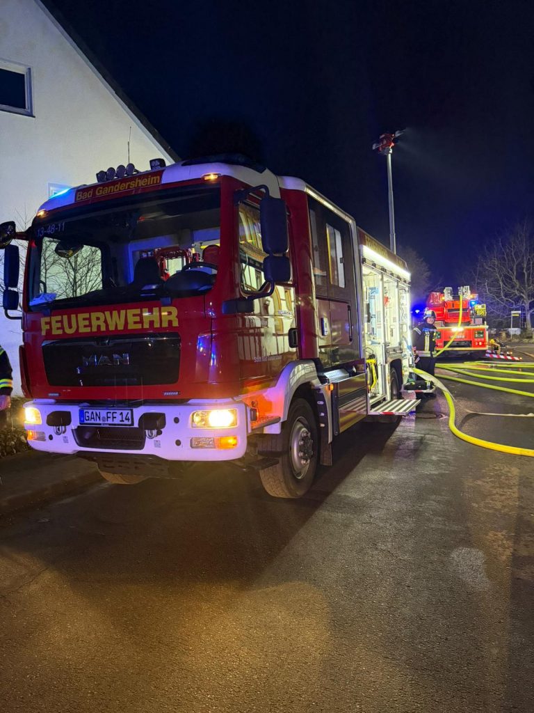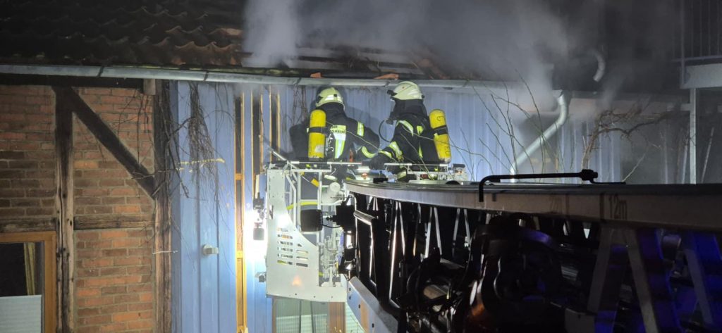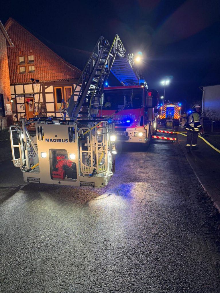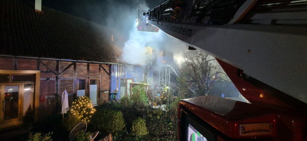 Die Ortsfeuerwehr Heckenbeck wurde gegen 00:49 Uhr mit dem Stichwort „brennt Komposthaufen am Haus“ alarmiert. Bei der Erkundung stellte sich jedoch heraus, dass sich der Brand bereits hinter der hölzernen Fassade ausgebreitet hatte. Daraufhin wurde umgehend die Schwerpunktfeuerwehr Bad Gandersheim mit einem Hilfeleistungslöschgruppenfahrzeug sowie der Drehleiter nachalarmiert. Parallel dazu leitete die Ortsfeuerwehr Heckenbeck den Löschangriff ein.