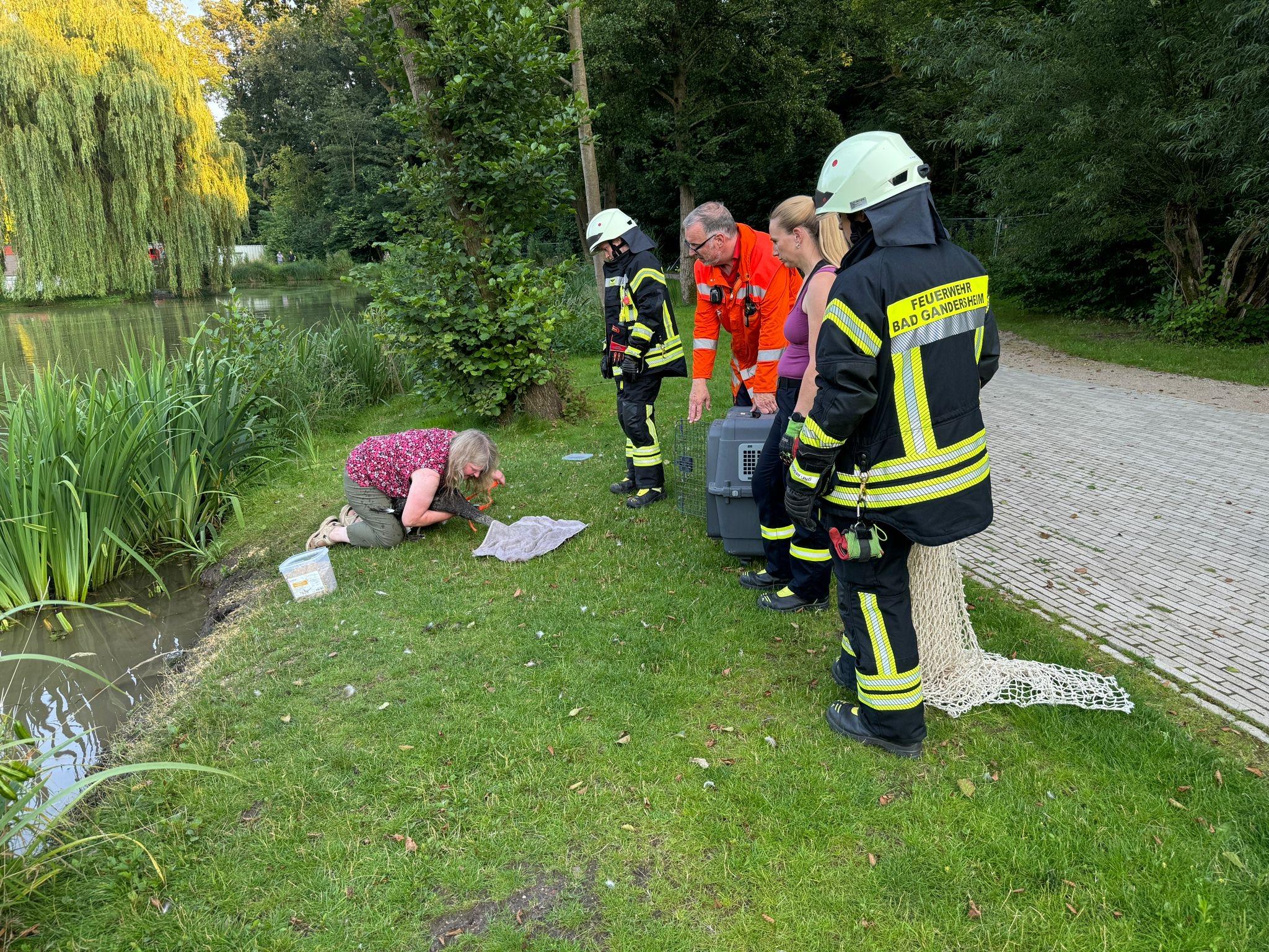 Freiwillige Feuerwehren der Stadt Bad Gandersheim - Tierrettung - "Schwan hat Angelschnur verschluckt", so lautete die Alarmierung für die Schwerpunktfeuerwehr Bad Gandersheim am Sonnabend 20.Juli 2024 um 19:24 Uhr. Aufmerksame Passanten hatten die Einsatzleitstelle Northeim über das verletzte Tier im Bereich der Osterbergseen auf dem Gelände der Landesgartenschau 2023 informiert. Wenige Minuten nach der Alarmierung war der stellv. Ortsbrandmeister Sven Probst vor Ort und hat die Schwanenfamilie zunächst auf einer Grünfläche ausgemacht. Bei der Annäherung suchten sie das Weite auf dem zweiten Osterbergsee. Ebenfalls zur Einsatzstelle waren ein Mitarbeiter der Stadtwerke, der Verwaltung und die Schwanenbeauftragte geeilt. Ein Anlocken der Schwäne mit Futter führte schließlich dazu, dass das verletzte Tier gefangen werden konnten. Zunächst wurde ein schweres Metallteil der Angelschnur abgeschnitten und somit dem Tier eine Entlastung gegeben. Das Tier wurde in die Tierklinik nach Northeim gebracht, um dort fachmännisch die Angelschnur aus dem Maul und dem Hals zu bekommen.