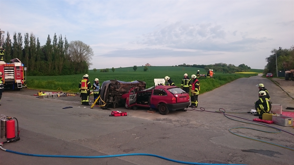 Auf dem Kriegerweg - Höhe LORO-Werk - Bad Gandersheim ist es aus noch nicht geklärter Ursache zu einem Zusammenstoß zweier Personenkraftwagen gekommen. Als Folge des Zusammenstoßes stürzte ein PKW auf die Seite. In den Fahrzeugen, einem Ford Fiesta und einem VW Polo wurden je eine Person mit dem Verletzungsmuster Polytrauma eingeklemmt. So lautete die Einsatzmeldung für die Zugübung der Schwerpunktfeuerwehr Bad Gandersheim. Unter Leitung der Zugführer Stefan Brackel und Sven Probst rückte die Ortsfeuerwehr Bad Gandersheim mit einer Besatzungsstärke von 22 Kameradinnen und Kameraden und dem Rüstzug zur Einsatzstelle aus. Nach einer kurzen Lageerkundung und Einweisung der Übungsteilnehmer galt es die verletzten Personen aus ihren Fahrzeugen zu befreien. Außerdem musste eine vermisste Person im näheren Umfeld mit der Wärmebildkamera gesucht werden.