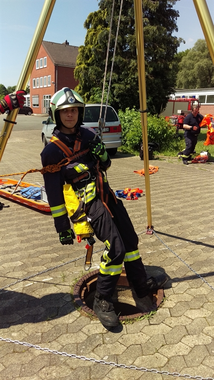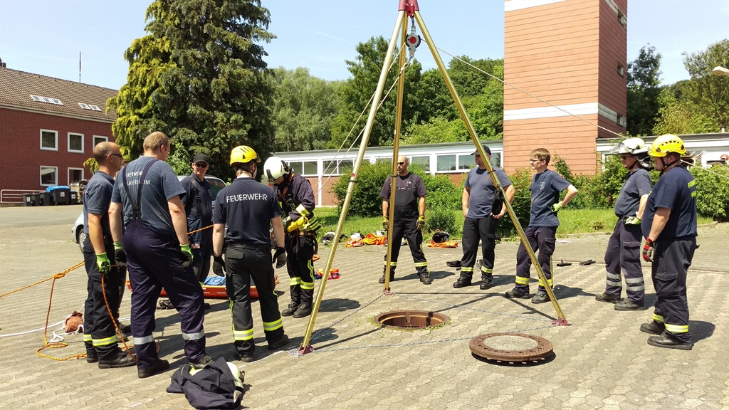 Am Samstag, den 04.06.2016 stand eine Weiterbildung für bereits ausgebildete Absturzsicherer auf dem Dienstplan. Nach detaillierter Planung im Voraus, begaben sich die beiden Ausbilder Kai Reuter und Jan Traupe (beide auch ausgebildet für die spezielle Rettung aus Höhen und Tiefen) zum Feuerwehrhaus der Schwerpunktfeuerwehr Bad Gandersheim. Besonders erwähnenswert ist das starke Interesse aller Teilnehmer, an dem komplexen Thema Absturzsicherung. Somit nahmen nicht nur ausgebildete Absturzsicherer an der Veranstaltung teil, sondern auch eine Hand voll Drehleitermaschinisten. Diese spielen in einigen Einsatz- und Übungsszenarien eine enorm wichtige Rolle.