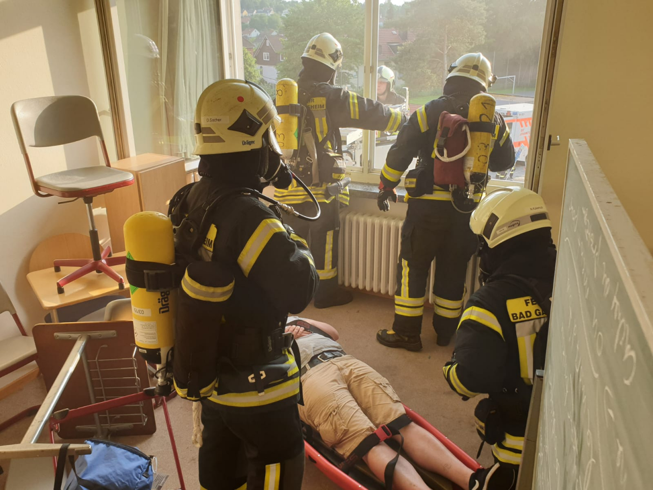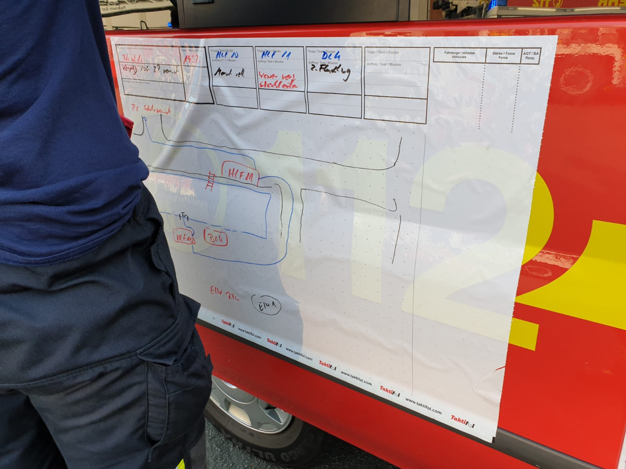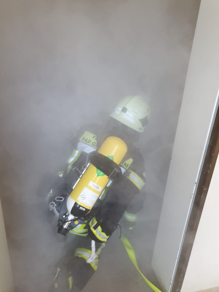 Nachdem eine vermisste Person über das Treppenhaus und die zweite Person über die Drehleiter gerettet wurde, verunfallte ein Atemschutzgeräteträger der aufgrund der Temperaturen kollabierte.Nachdem „Mayday“ wurde sofort der Sicherungstrupp in das Gebäude geschickt, der den verunfallten Kameraden dann untersuchte und gerettet hat.