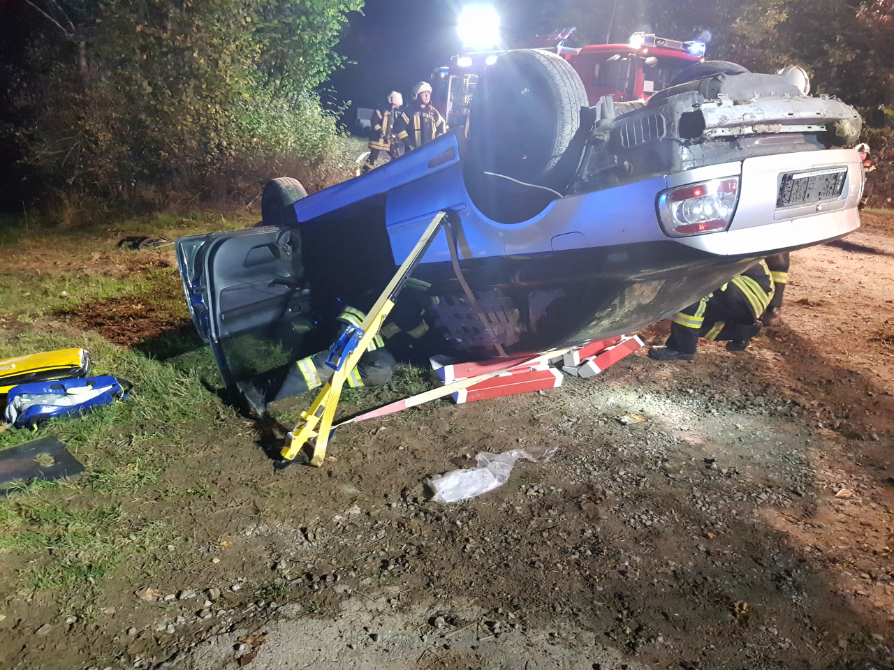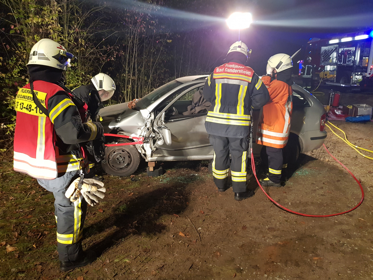 Auf dem Wadenberg in Bad Gandersheim ist es aus noch nicht geklärter Ursache zu einem Zusammenstoß zweier Personenkraftwagen gekommen. Als Folge des Zusammenstoßes stürzte ein PKW auf das Dach. In den Fahrzeugen, einem Skoda Octavia und einem Audi A4 wurden je eine Person mit dem Verletzungsmuster Polytrauma eingeklemmt.