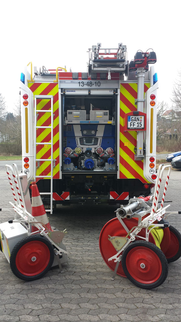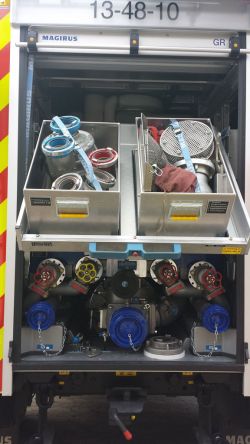 Hilfeleistungslöschgruppenfahrzeug Pumpenansicht In dieser Ansicht sind die Gerätschaften von dem Gerätefach GR